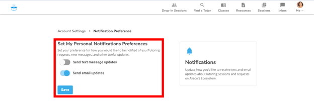 Set notification preferences for tutoring requests, new messages, and other useful updates. Users have the option to receive text messages and/or email updates by toggling on/off the switches next to each setting and clicking “Save.”