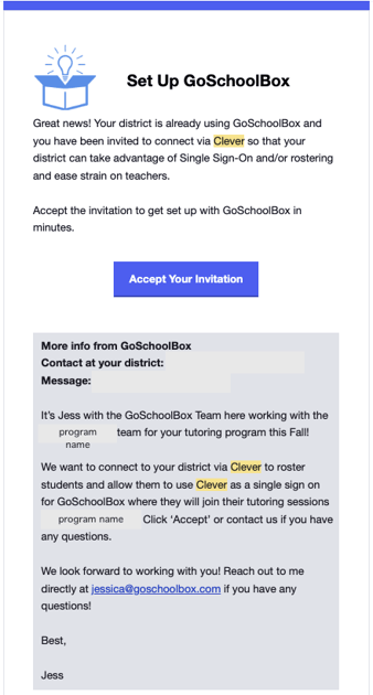 - GoSchoolBox will send the Clever request to the district based on what information provided regarding what information the district would like to share. The school district administrator will need to accept the sharing request. In order to send a request, GoSchoolBox will need: