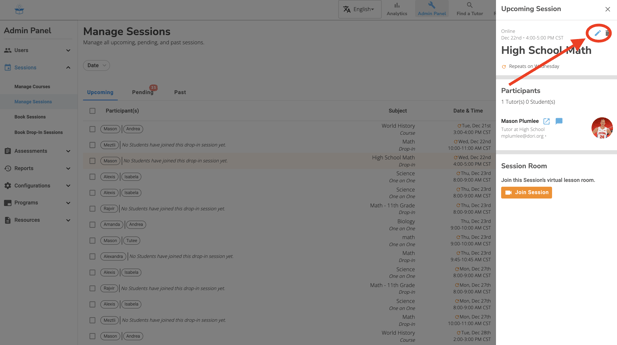 Administrators can create and edit drop-in sessions with a tutor or a group of tutors that allow students to join if and when they have questions relating to the drop-in session subject.