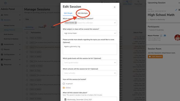 - If the edits need to be applied to all sessions be sure to select "edit multiple"