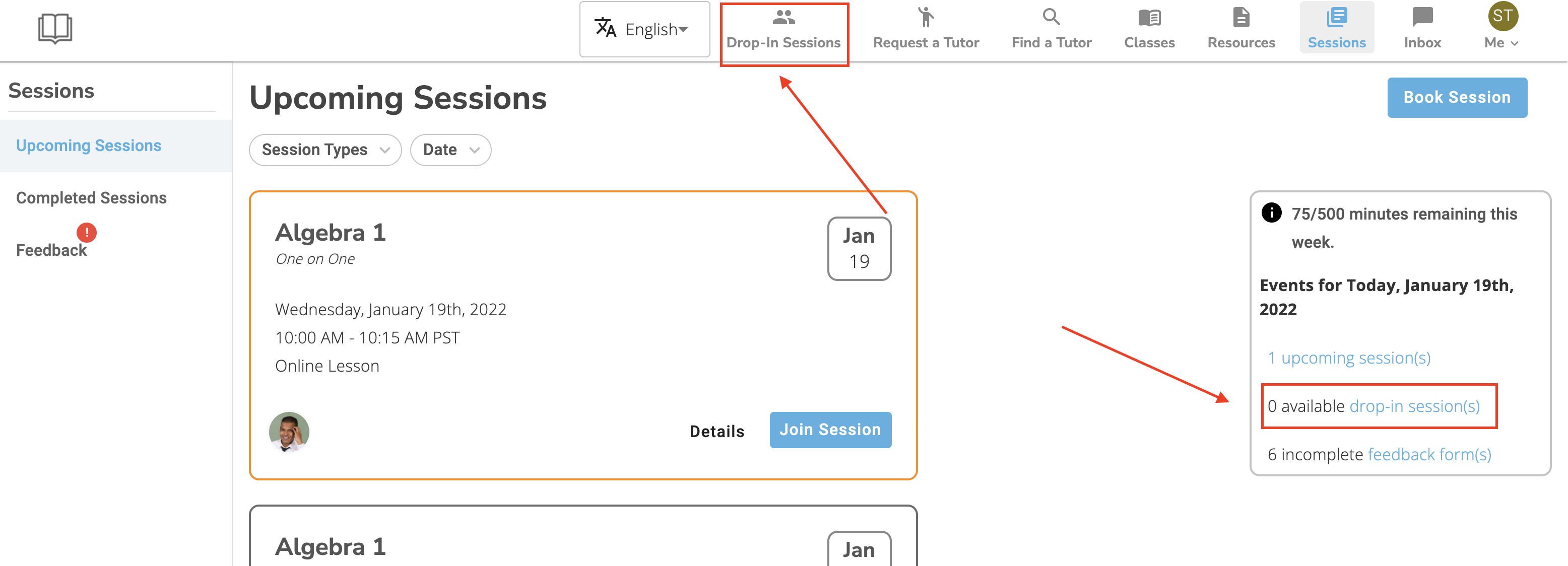 - Students will be able to see the drop-in sessions on the drop-in sessions page or by selecting the link on the sessions dashboard.