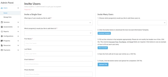 After clicking the blue “invite users” button, an admin will see the form below. Fill in the left side to add a single user..