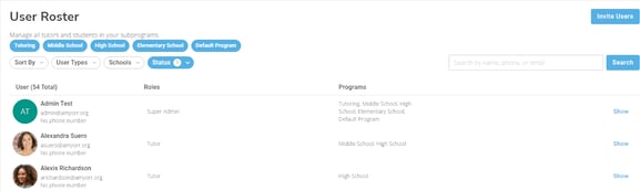 Administrators can invite new users to the platform by clicking the blue “invite users” button in the top right corner of the User Roster page.