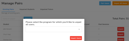 To unpair all users, click the orange “Unpair All Users” button in the top right corner of the Manage Pairs page