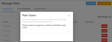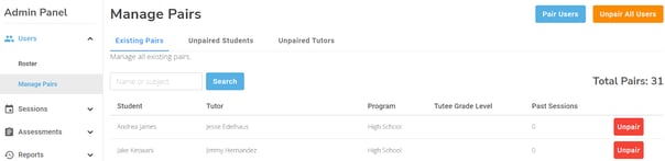 A pairing (between tutor and student) is automatically created when a session is booked (booking a session creates an online link between the users). An admin can also manually pair two users (see instructions below). All pairs (regardless of how the pairing has been made) are visible in the Manage Pairs section of the User Roster.