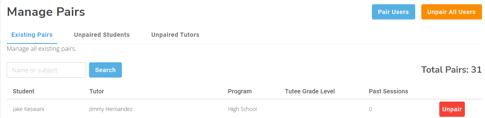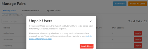 To unpair a single tutor and a single student, click on the red “unpair” button on the right. Clicking will generate a reminder that unpairing does not remove existing sessions (navigate to Manage Sessions and click the blue “details” button on the right to delete sessions between these two users)