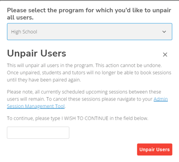 Unpairing all users is an efficient way to remove all existing pairs, but it is not a step to be taken accidentally. For this reason, a warning will appear as soon as you select the program from which pairs will be removed. In order to proceed with unpairing all users, you must type the words “I wish to continue” before you can click the red button to “Unpair Users”