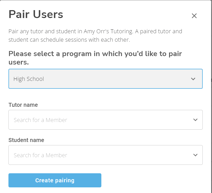 After you select a program, the window will expand and you can select the name of the tutor and student you would like to pair. Click the blue “create pairing” button to finish the pairing. The new pair will now show on the Manage Pairs page.