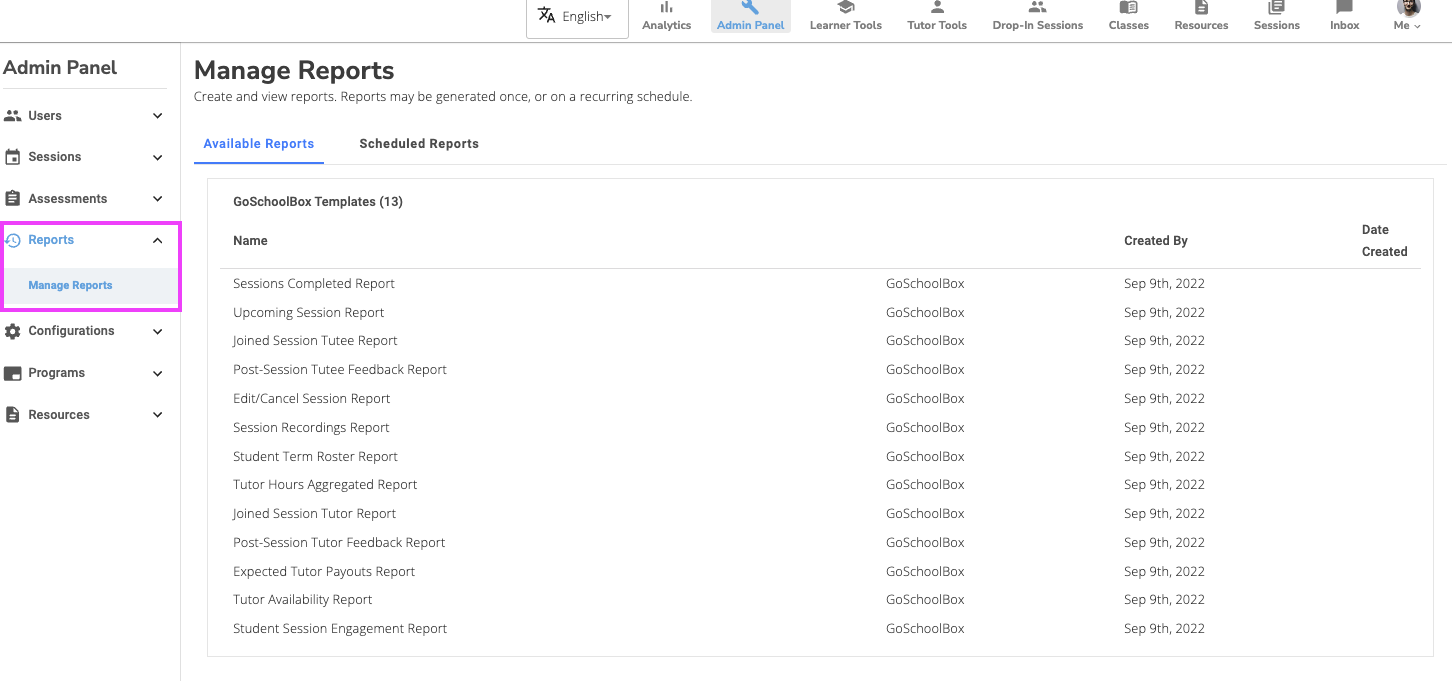 Administrators can schedule reports and generate one time reports about completed and upcoming sessions, tutor and tutee post-session feedback, and tutor hours.