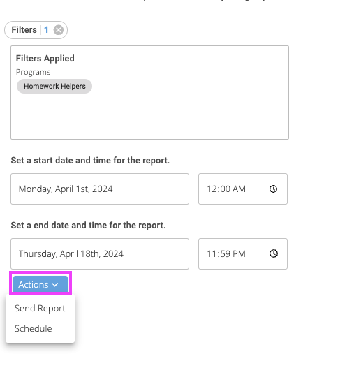 - Select the "Actions" blue button at the bottom and select "send report" to send a one-time report. Select "Schedule" if the report should be sent out automatically on a daily, weekly, or monthly basis.