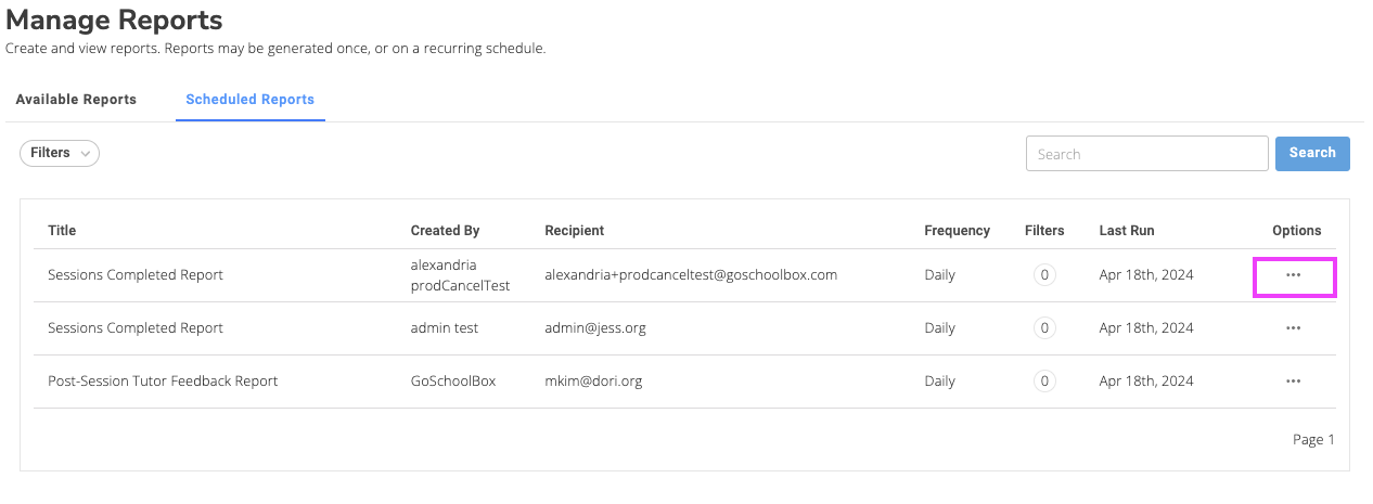 To manage a scheduled report, select the three dot options button to the left of the report name.