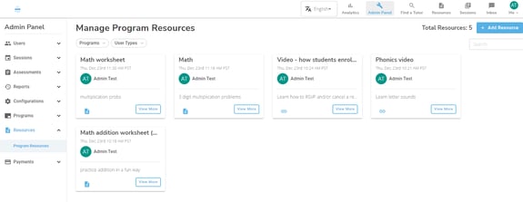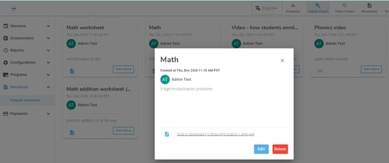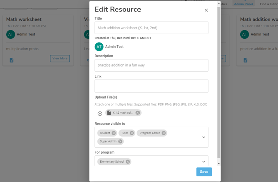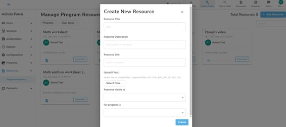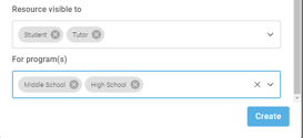 At the bottom of the pop-up window, use the drop-down arrows to select which programs and which individuals will have access to the resource You can make a resource visible to a student, a tutor, a program admin, an ecosystem admin, or all of the above. You can also limit a resource to certain programs (ie - a phonics video might be limited to an elementary school program) or you can make it available to all programs. After you click the blue “create’ button, your resource will appear on the Resources screen.